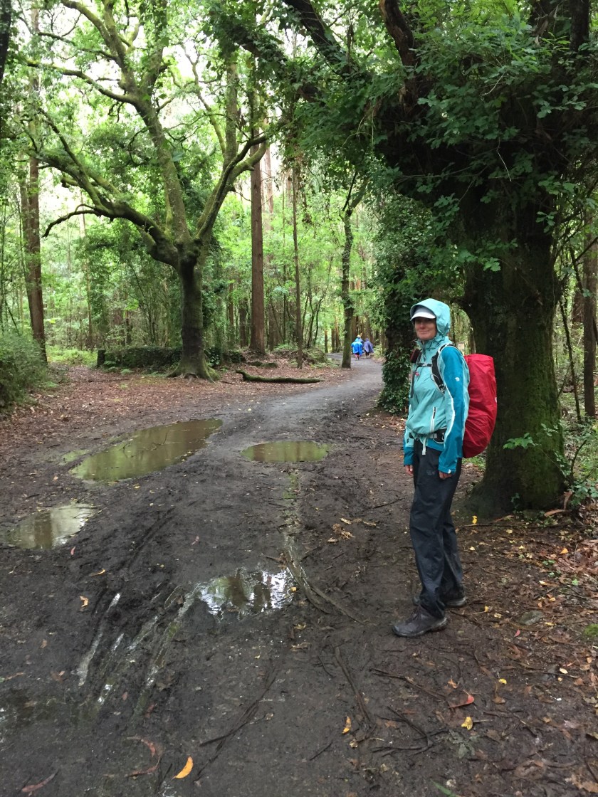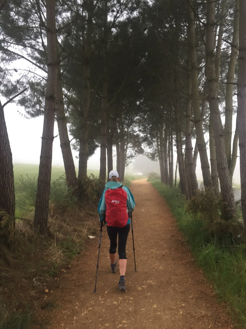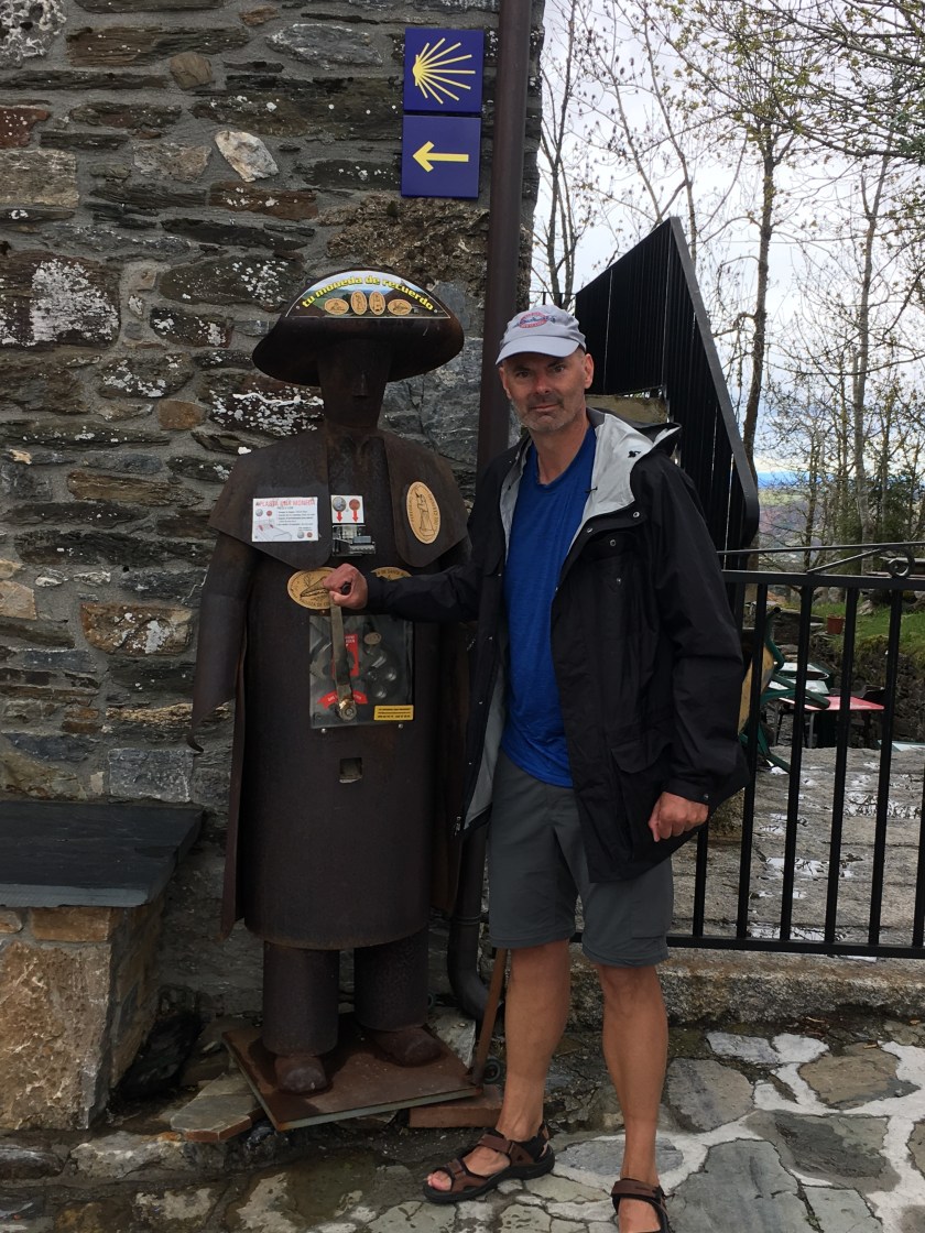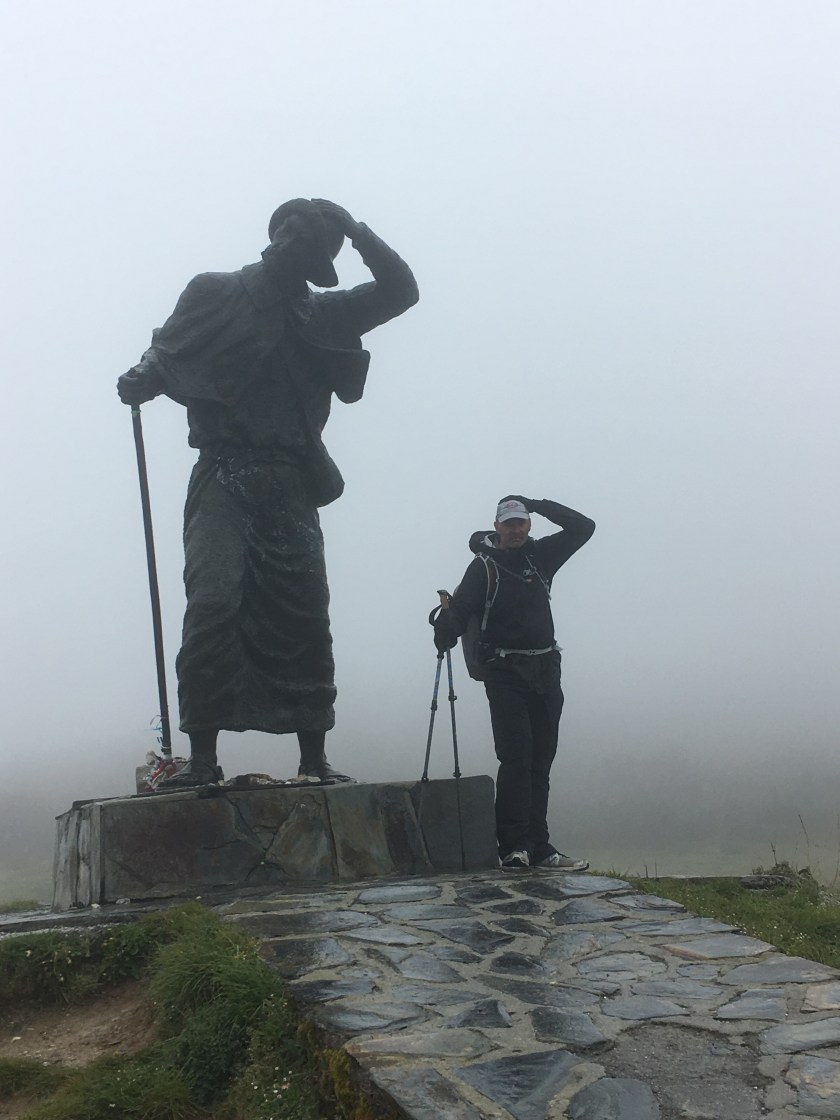 Sean with a pilgrim statue, you couldn’t see anything beyond that. A very foggy and rainy start to the day.