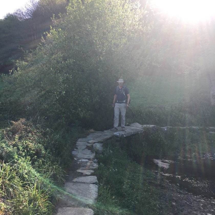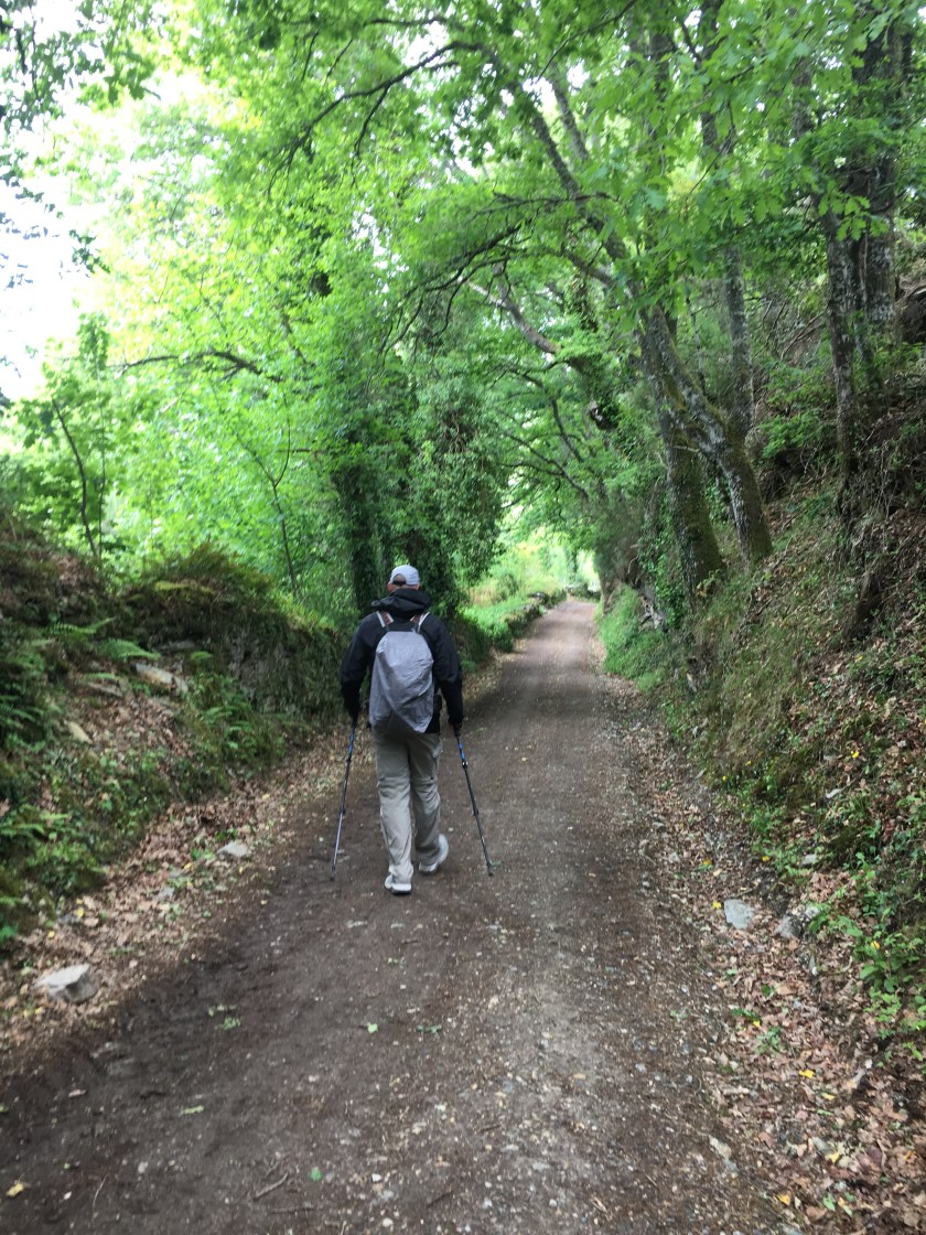 May 9, 2017 – 15.5  miles (25 Km) – We left Portomarin early under cloudy skies, as we were trying to beat the rain. It felt very muggy. As soon as we left town we went up some pretty good hills, until we got above the fog. It was a beautiful view! We walked through a lot of the same scenery as yesterday, very green, lots of trees. We have been walking through lots of cattle farms these last three days. The smells are at times pretty hard to take, and there’s quite a few cow droppings along the way, you have to watch your step!