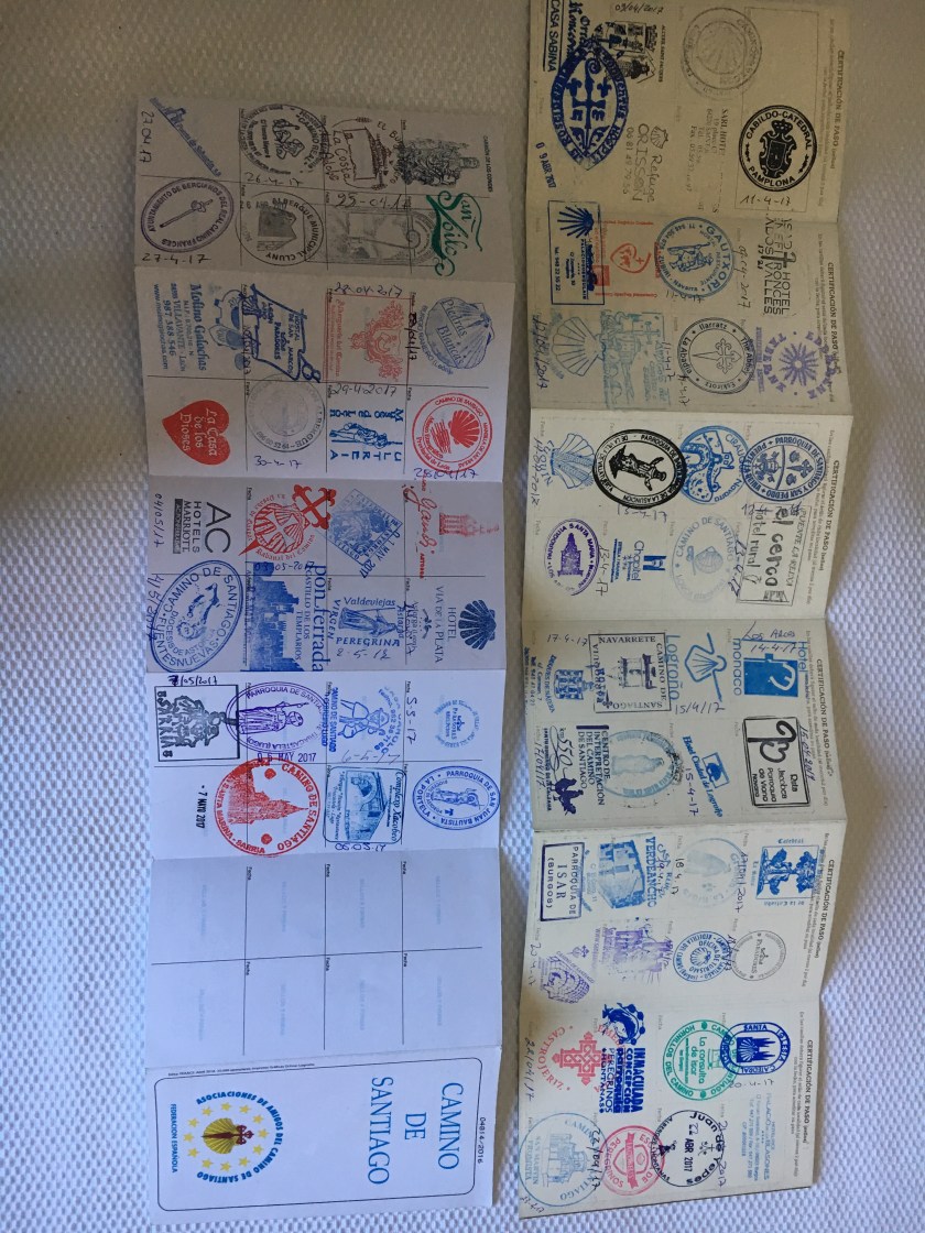Our Pilgrim credential or passport with stamps from our whole trip. Only a few spots left! We each filled 2 of them.