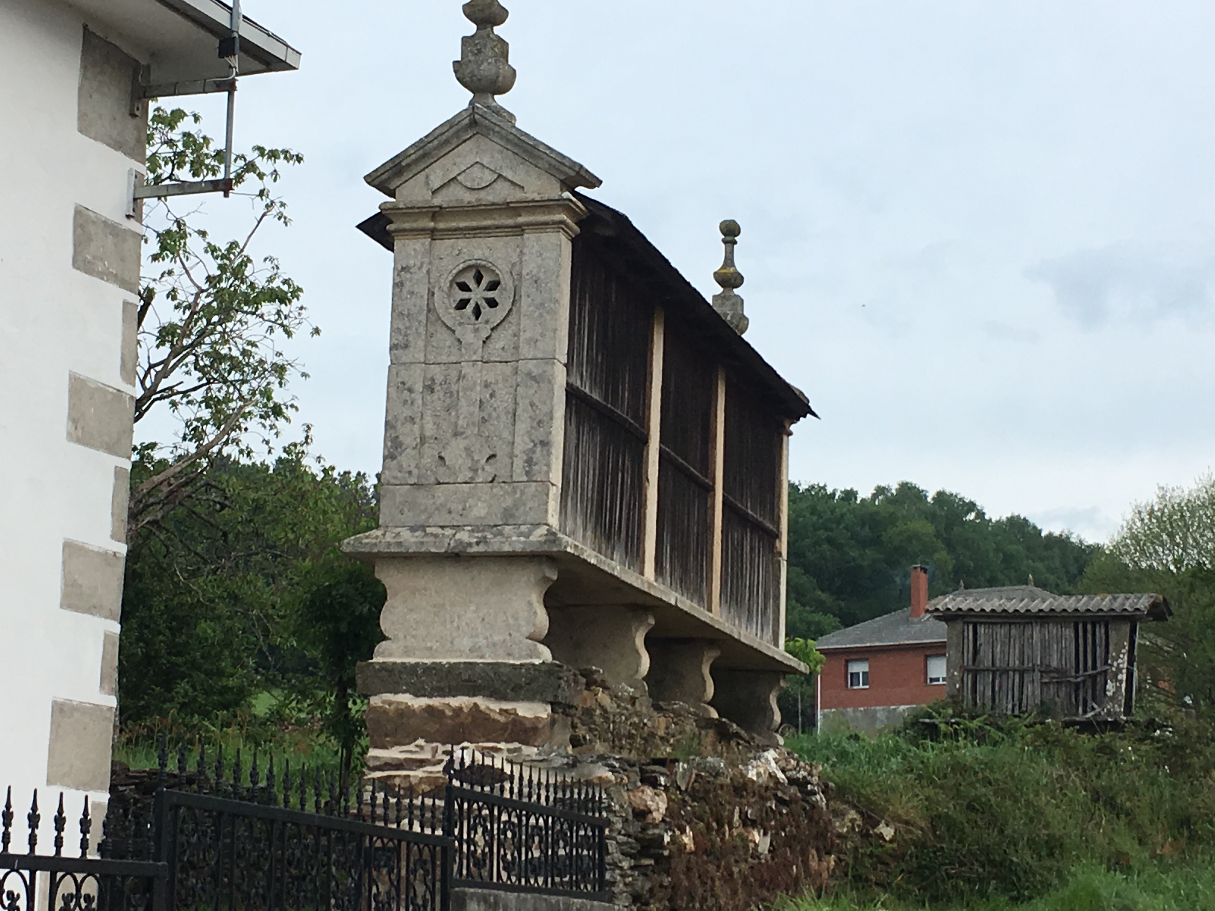 May 6, 2017 – 13 miles (21 Km) – We had a very grey start to the day. Luckily we had a little break in the weather yesterday before going to bed (yes, it was still light outside), so we had pictures of the scenery in O Cebreiro. This morning we couldn’t see anything at all, as the clouds were very low, and it was raining. Despite being told that were were on the top of the world yesterday, we started going uphill (what????!!). Luckily that wasn’t too long. We walked mostly on trails, with no visibility for a few miles, then it started to clear up a bit. We got some rain along the way, and after we got to Triacastelo it was pouring. The last part of the walk today was a steep downhill, not great for the knees, but we managed to do it without problems.