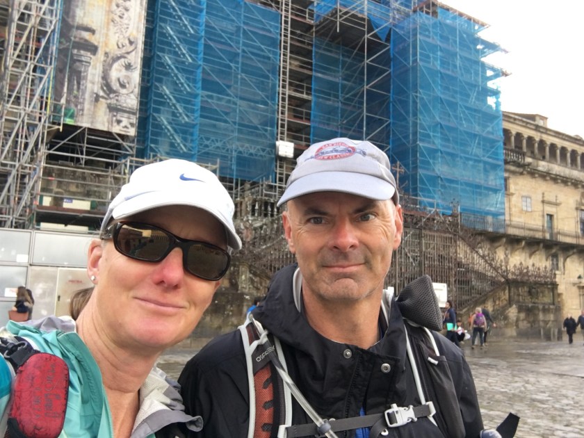 May 12, 2017 – 10 miles (16 Km) – After 34 days of walking we made it to Santiago!! It rained most of the walk, but when we walked into Plaza Obradoiro, where the cathedral is, the rain stopped and the sun even came out for a bit. It was a weird moment, glad to be done, but sad because we were done. We then went to the pilgrim office to get our Compostelas and certificates of distance. We waited for over an hour. We met with someone we walked for a few days, and had lunch, then got a massage and went to the pilgrim mass. They usually have a ceremony with the Botafumeiro, a huge incense container that swings from the ceilng in the cathedral and swings towards the sides, it takes 8 men to make this work. Unfortunately they don’t have that on Friday evenings, so we will try to catch it tomorrow.Happy to be In Santiago. Will try to post a little recap tomorrow.