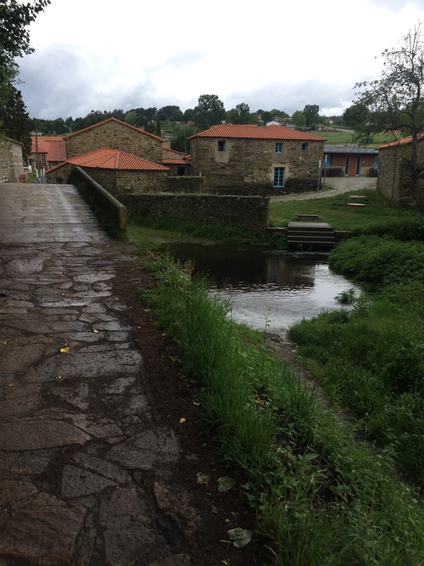May 11, 2017 – 14 miles (23 Km) The day started out with rain, and it rained on and off all day. There were a lot of puddles and mud, which at first we were trying to avoid, but it became useless after a while. By the time we arrived to Amenal our feet were soaking wet. Not much to say about the walk, it was mostly  on trails, but some next to the road or crossing it, which is no fun in the rain with the cars driving at fast speed next to you. We’re staying at an old mill today again. We did take a little walk down the river to soak our legs in the cold water as it helps.